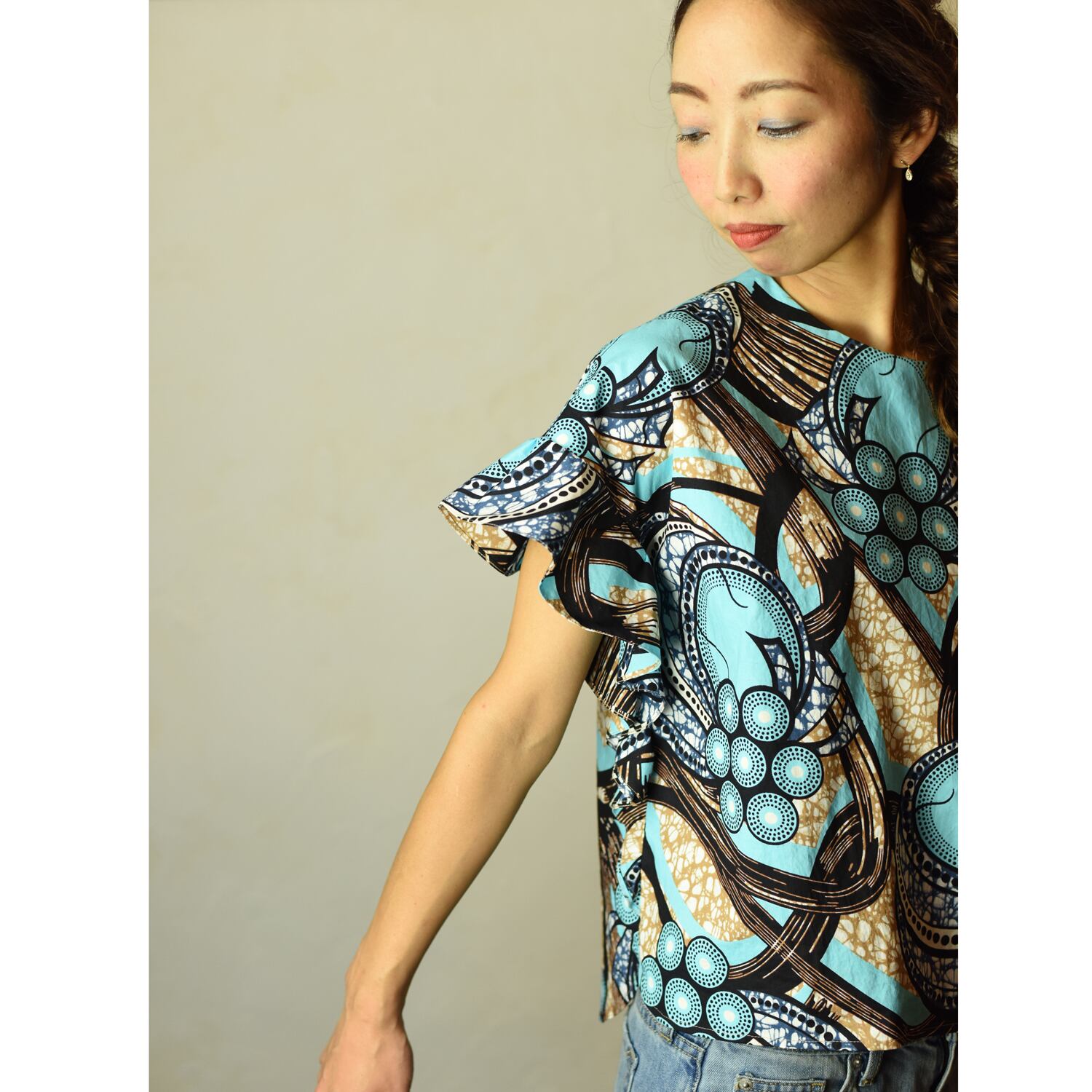 キテンゲと言われるアフリカンプリント生地を使ったドルマン風のフリル袖のブラウス。