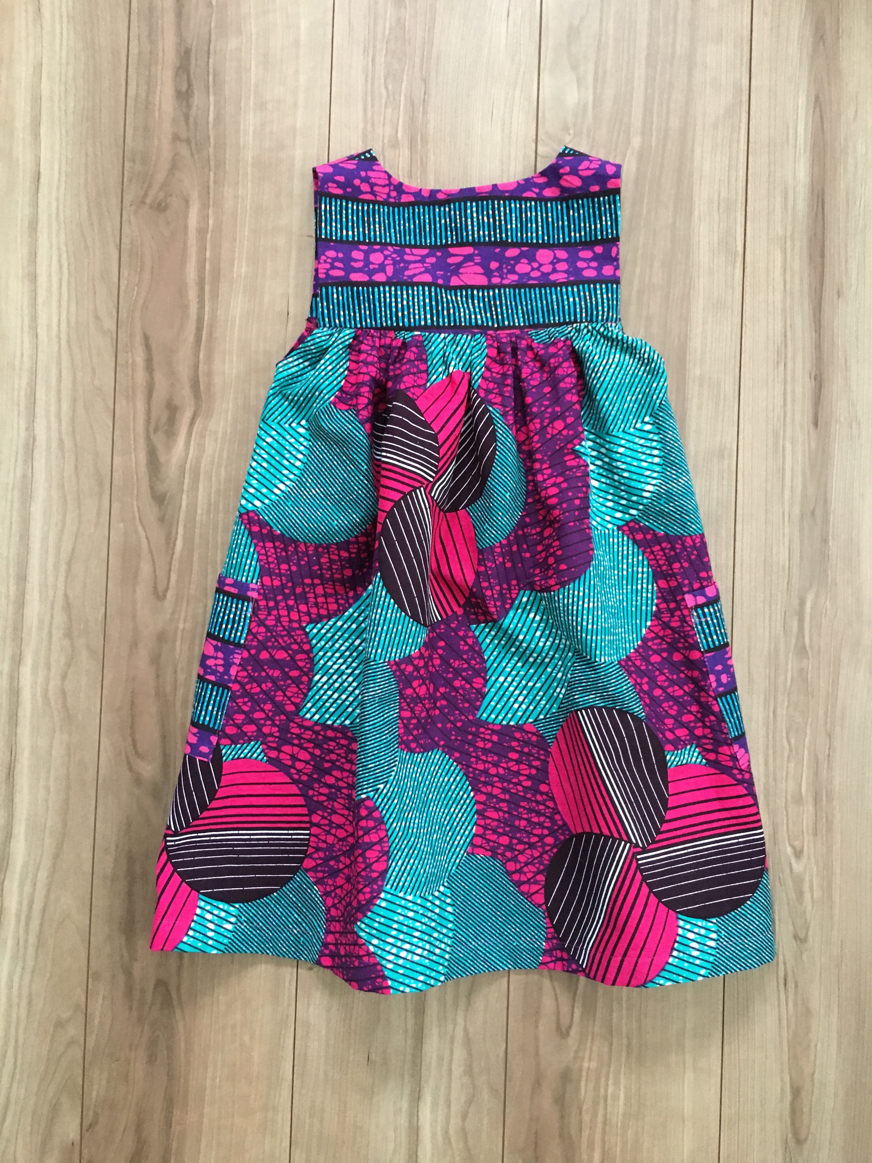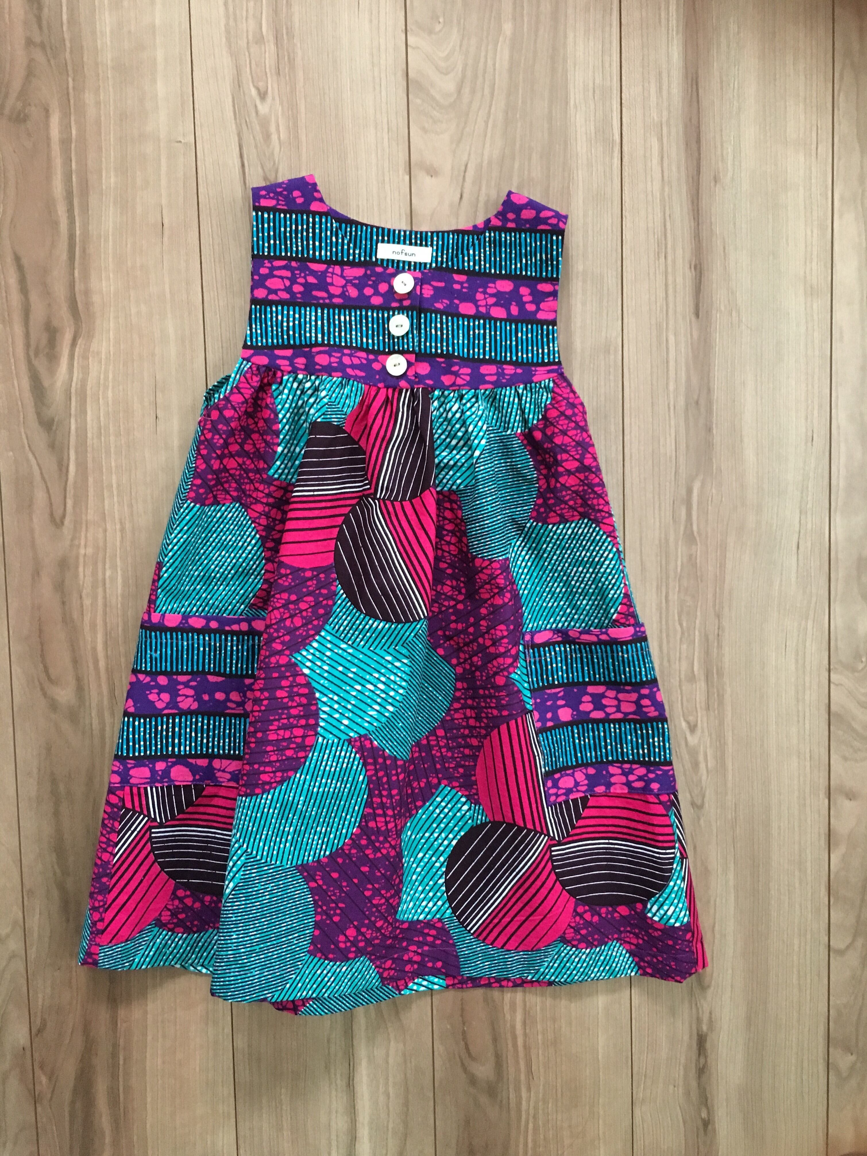 キテンゲと言われるアフリカンプリント生地を使用した柄MIX切り替え女の子ワンピース。女の子の大好きなピンク色系の柄MIXで作りました。