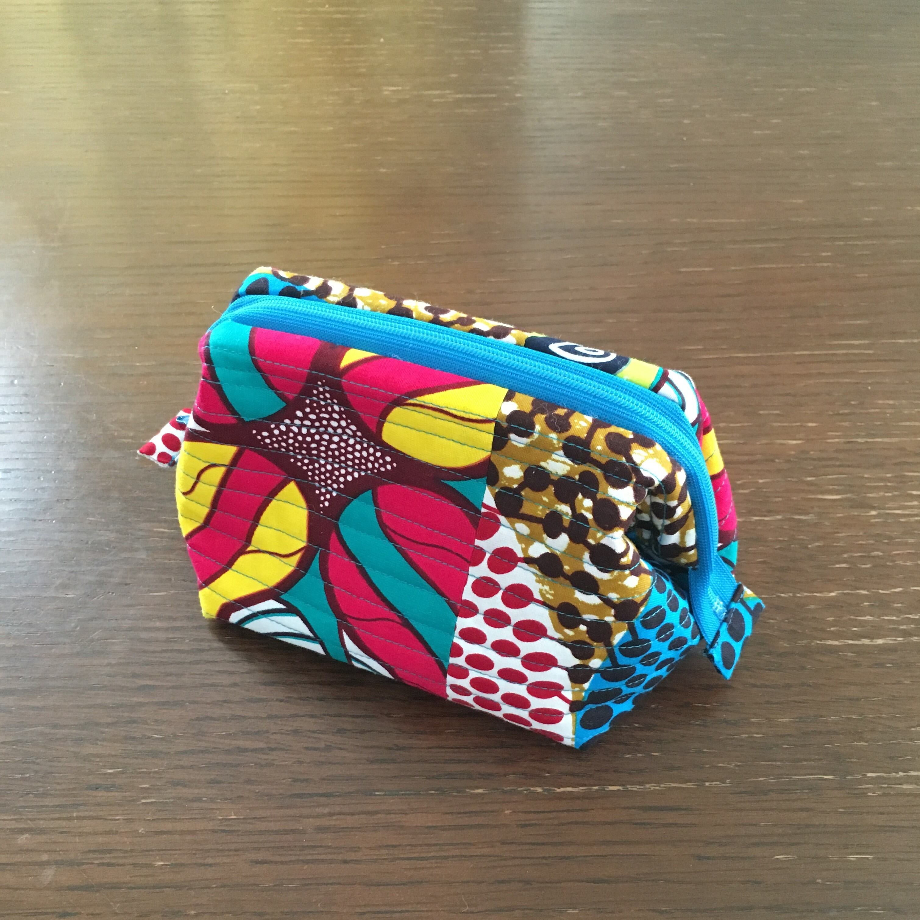 キテンゲと言われるアフリカンプリントの個性的な生地の柄MIXでポーチを作りました。柄をキルティングをしており、ステッチがいきています。口金入りなので、大きくあき、中身が見やすいです。