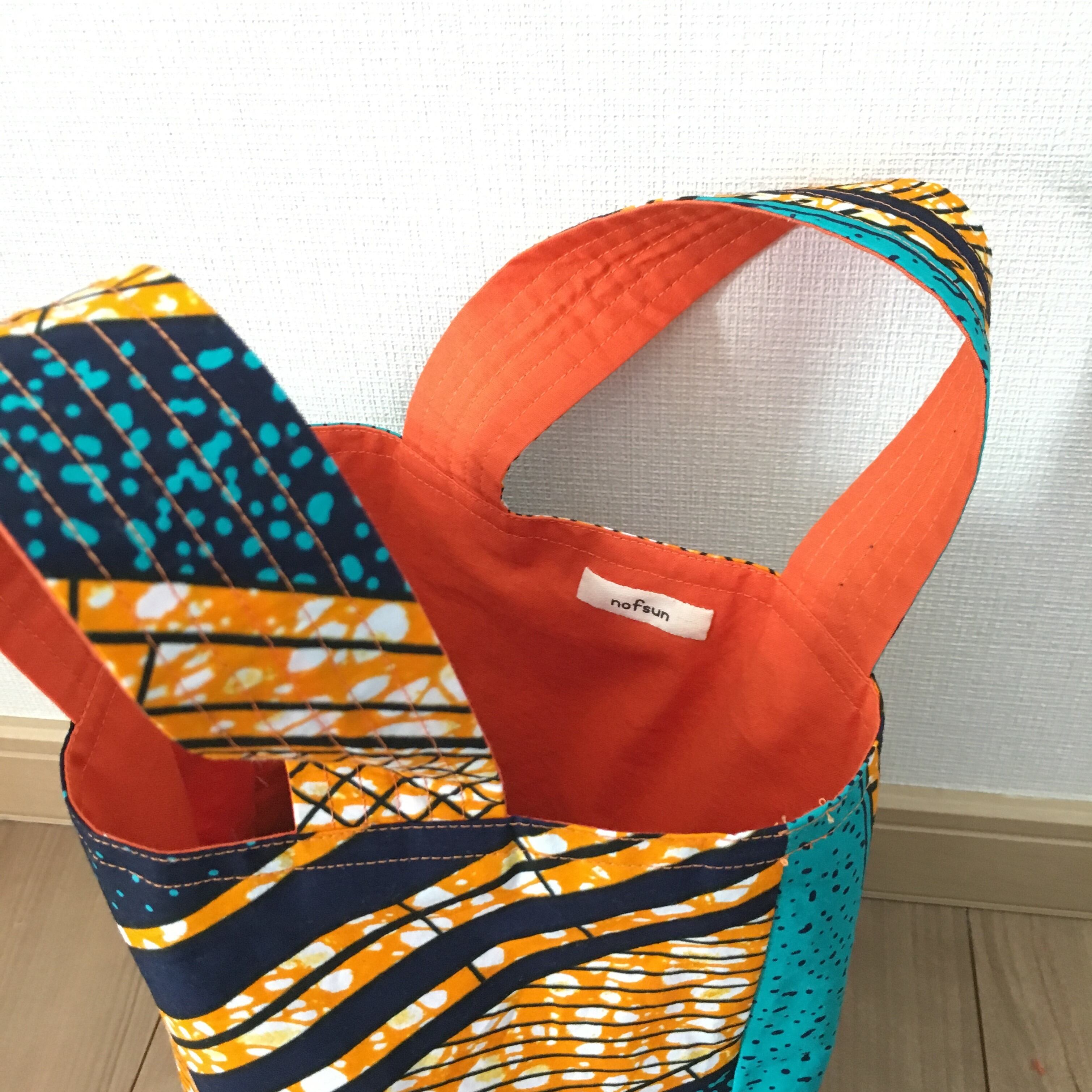 キテンゲと言われるアフリカンプリントの個性的な生地で小さなトートバッグを(裏地付き)作りました。