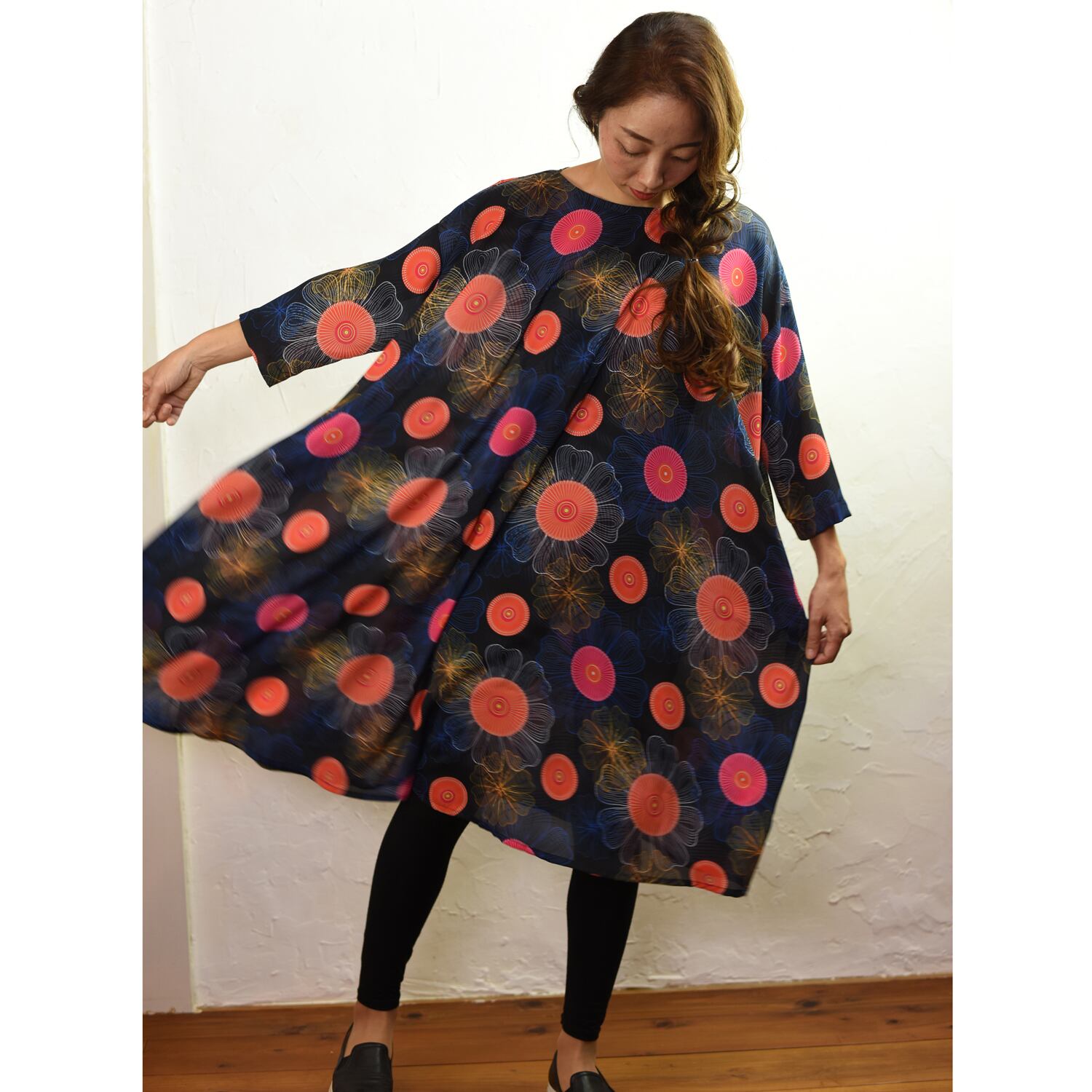 アフリカンプリントのシフォンジョーゼット素材で作ったAラインのフレアワンピースです。