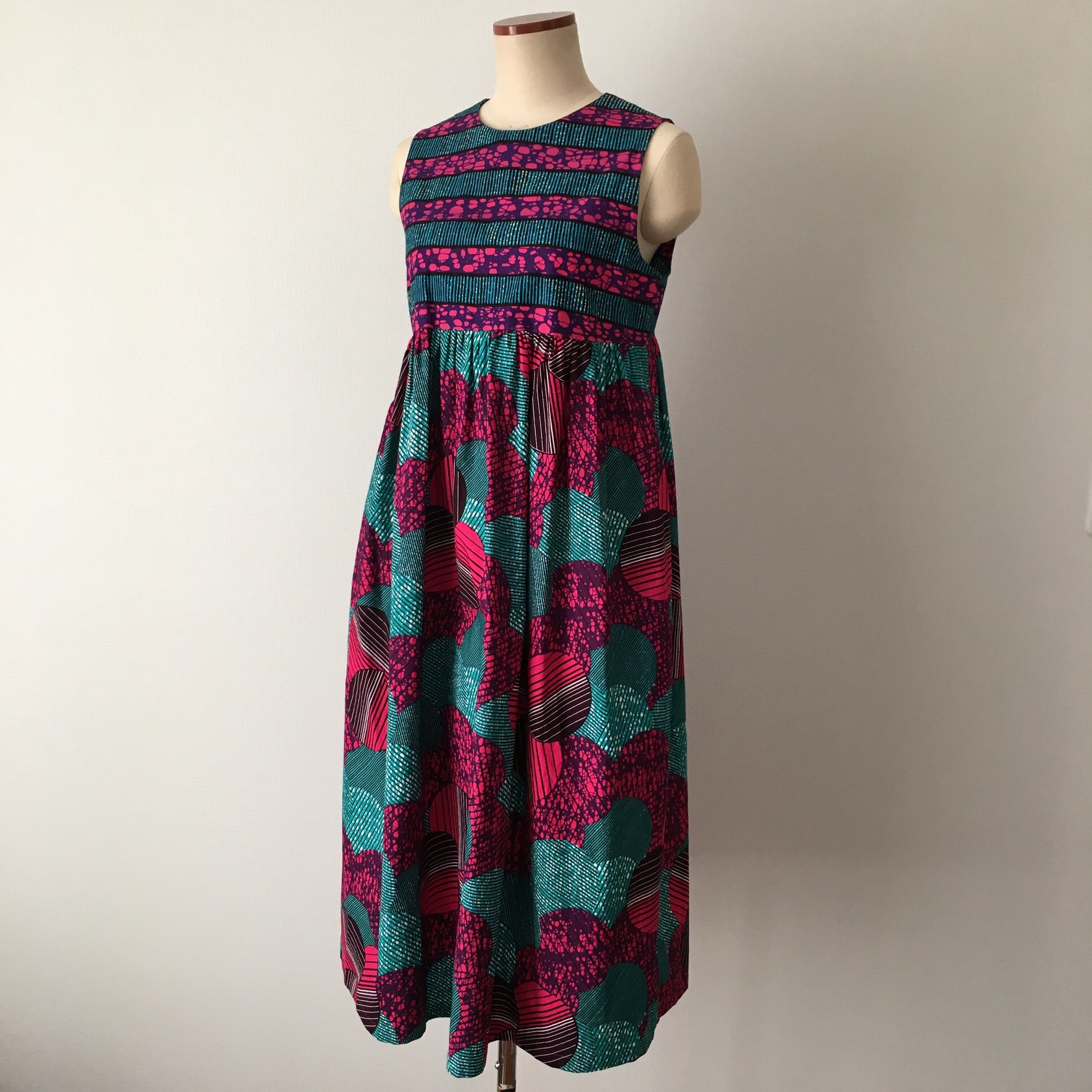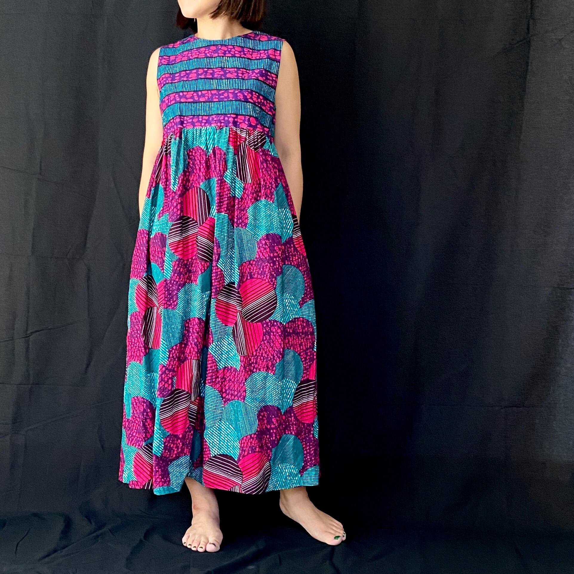 キテンゲと言われるアフリカンプリント生地を使ったハイウェストでスカートはギャザーの入ったワンピース。同系色の違った柄をMIXして少し遊び心をもたせた印象に。両側にポケットがついています。