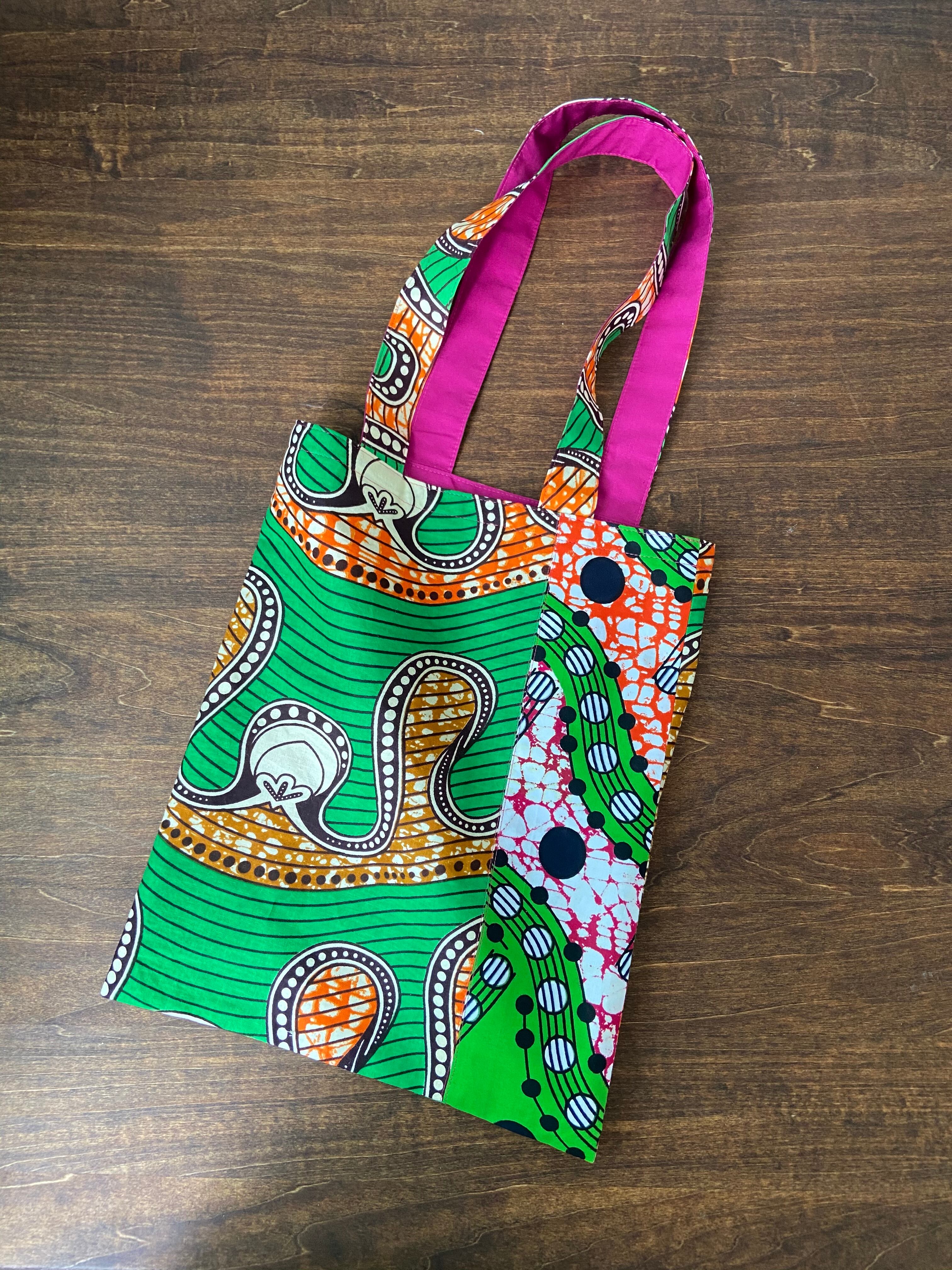 キテンゲと言われるアフリカンプリントの個性的な生地でぺたんこトートバッグを(裏地付き)作りました。