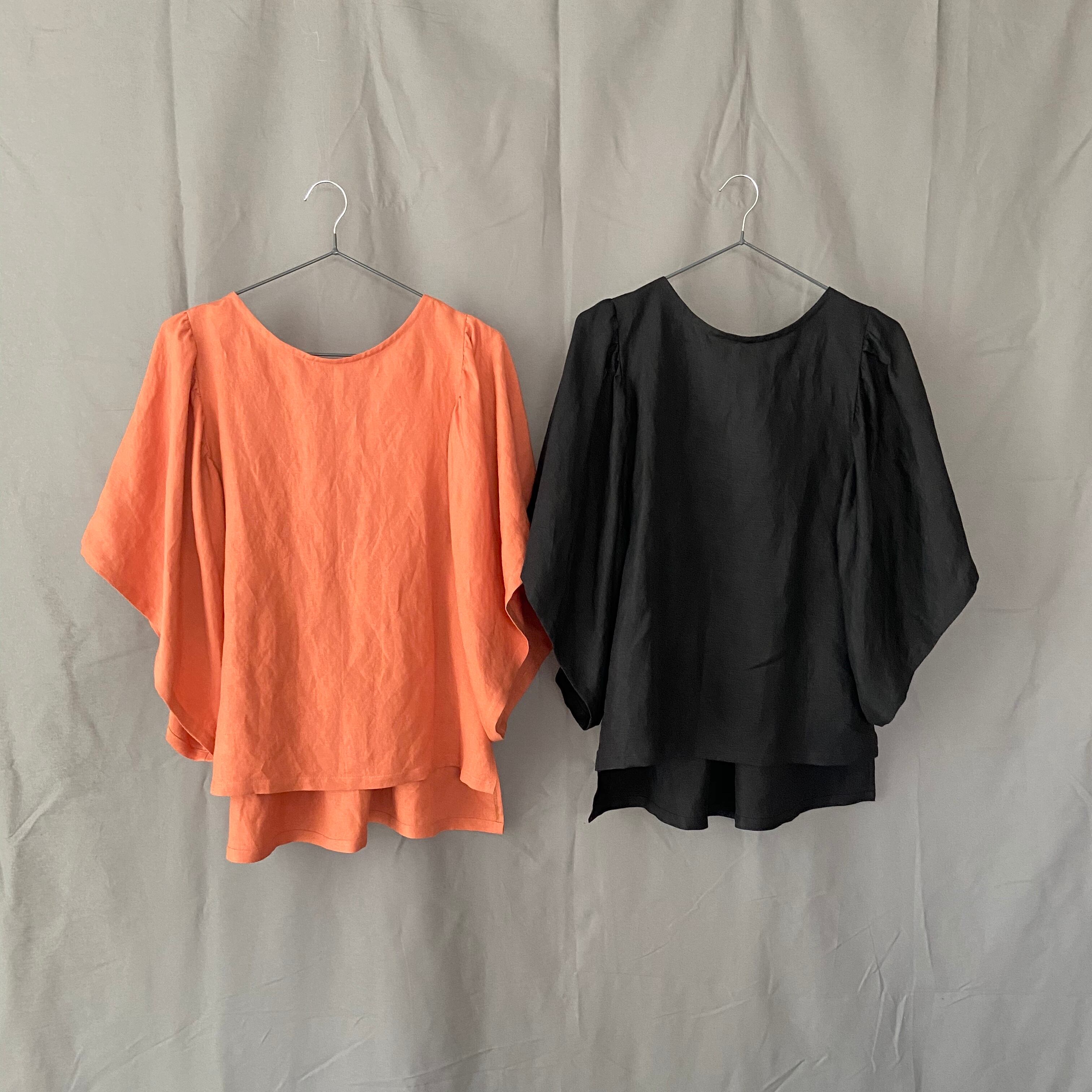 素材は麻の風合いを生かしつつ、レーヨンが入っているので柔らかくしなやかな印象です。肌触りがよく、夏でもサラッと涼しげに着て頂けると思います。また、秋口でも袖がゆったりしているので、重ね着しても素敵です。