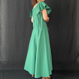 襟もとからお腹の辺りまで華やかなラッフルをあしらったワンピース。