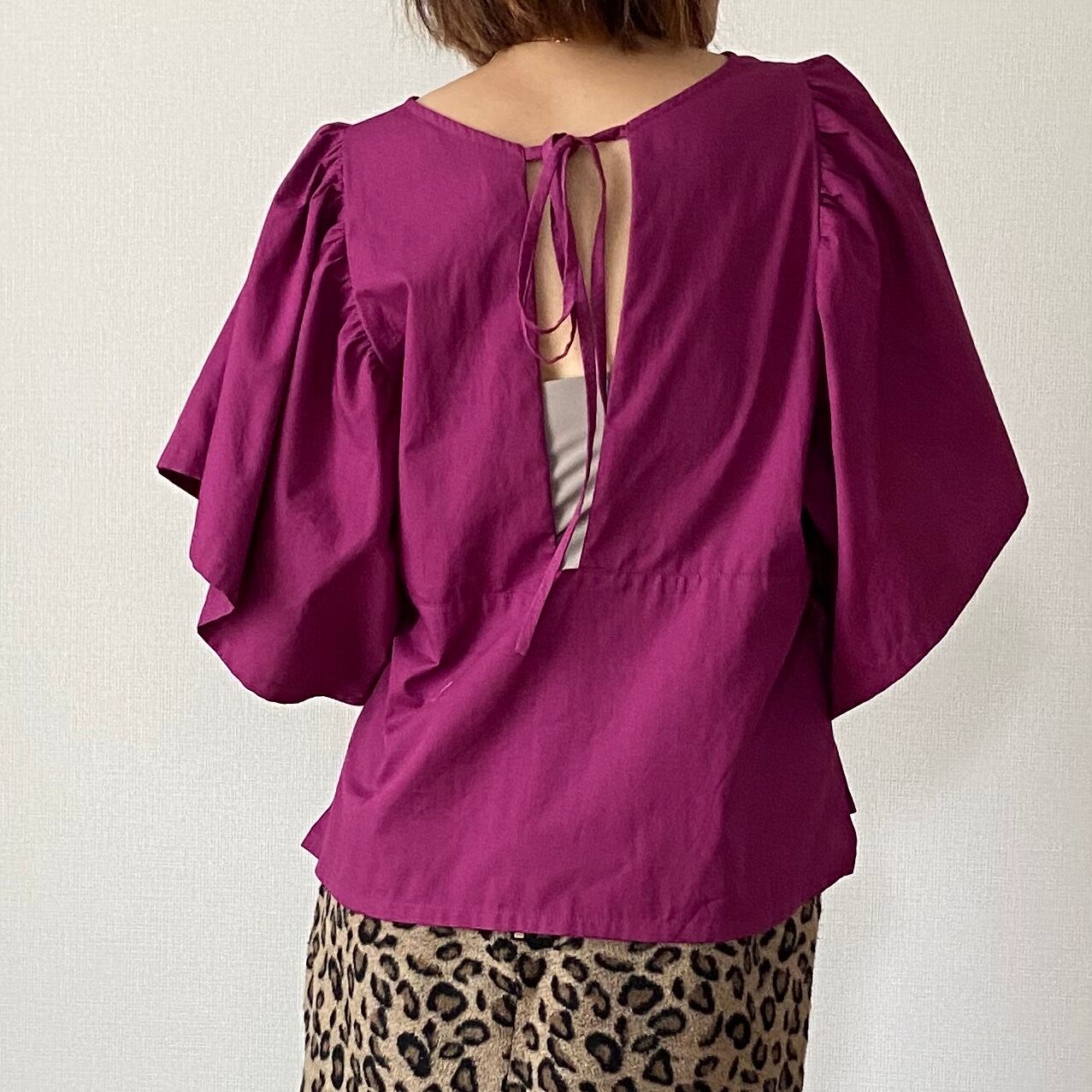 袖はやや内側からたっぷりとギャザーでボリュームを持たせたブラウスです。フロントはすっきりと、背中は少しだけあいてリボンで結び、後ろ姿を演出するデザイン。