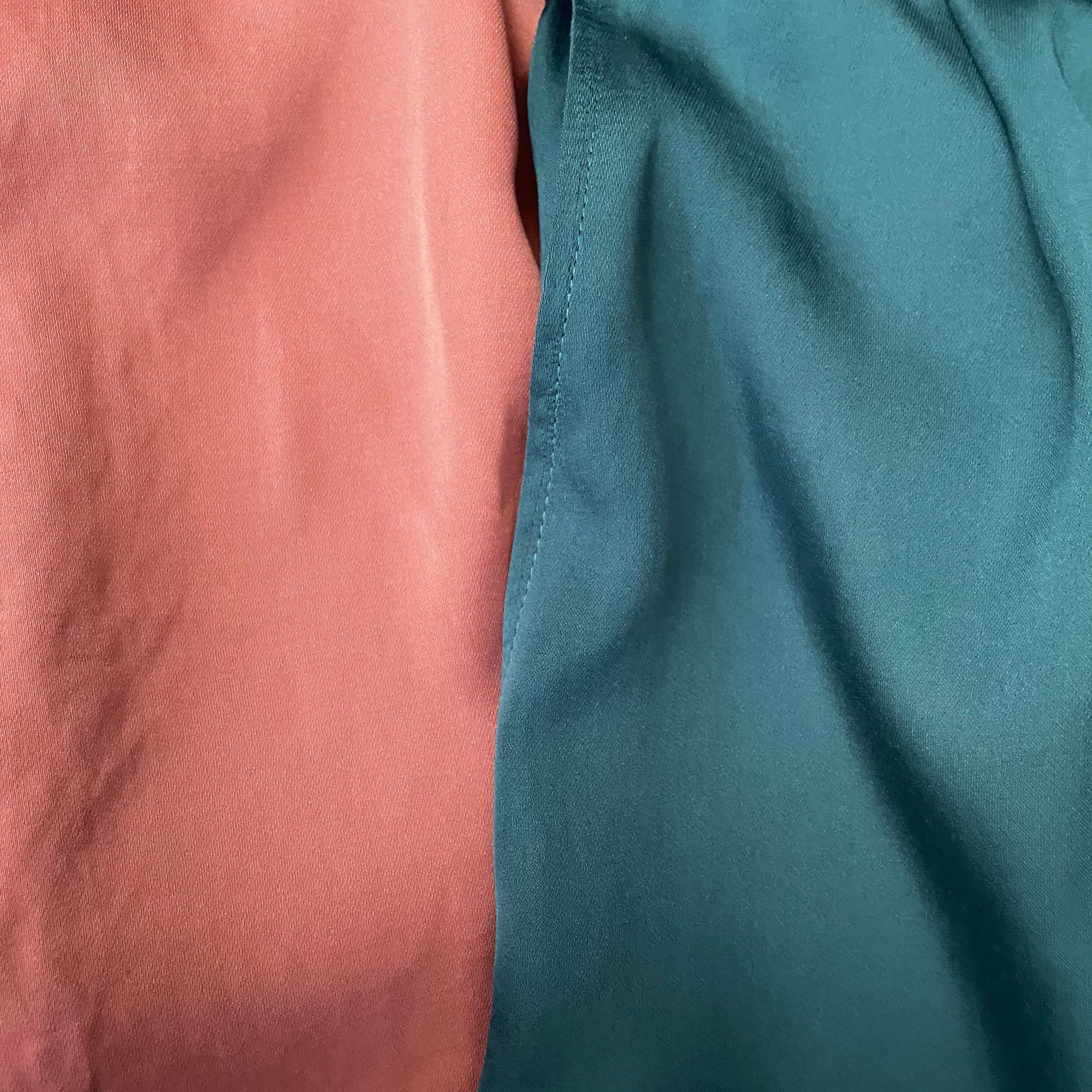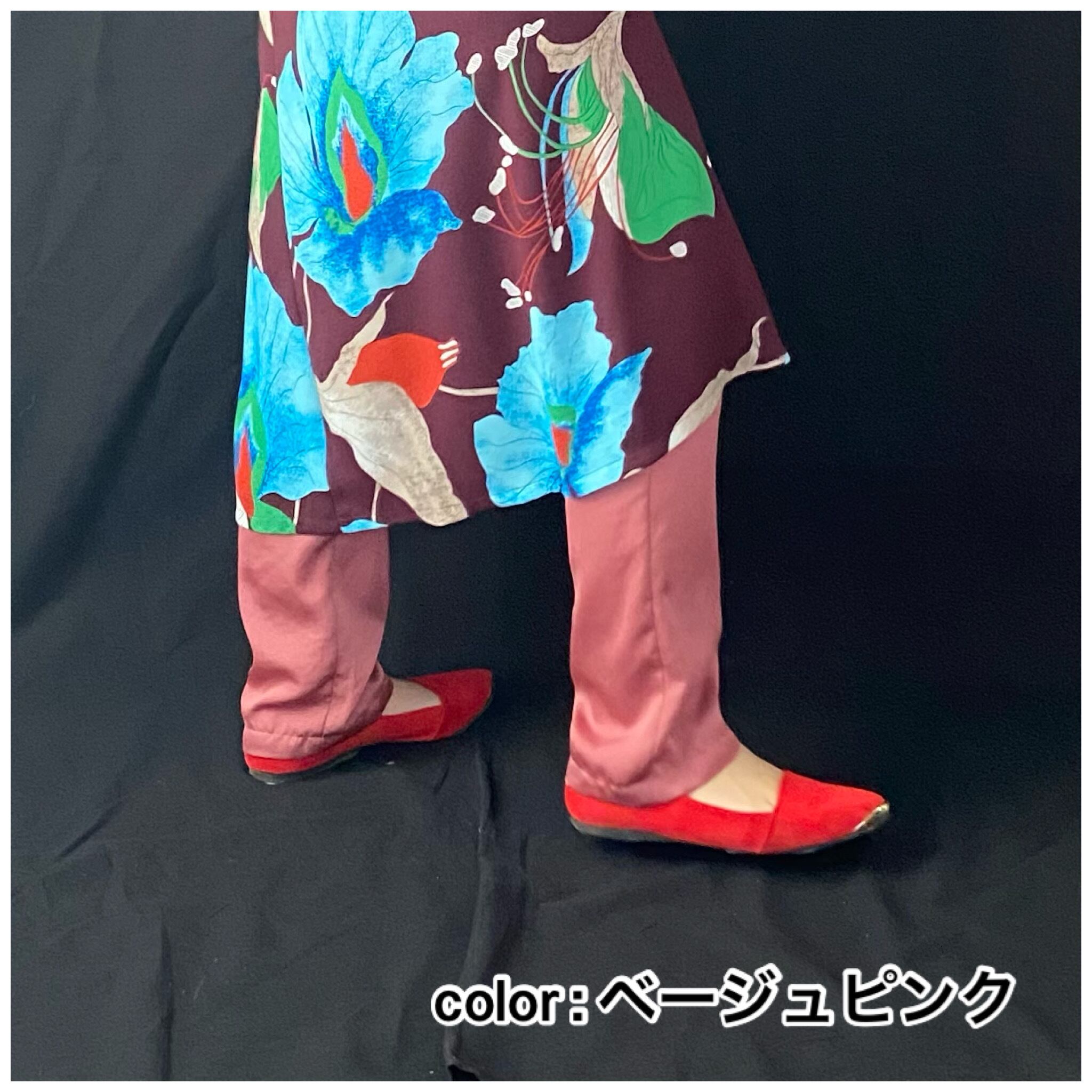 ポリエステル製サテン生地のタックパンツです。薄く柔らかくとろみのある素材感で、控えめな光沢のサテン生地です。