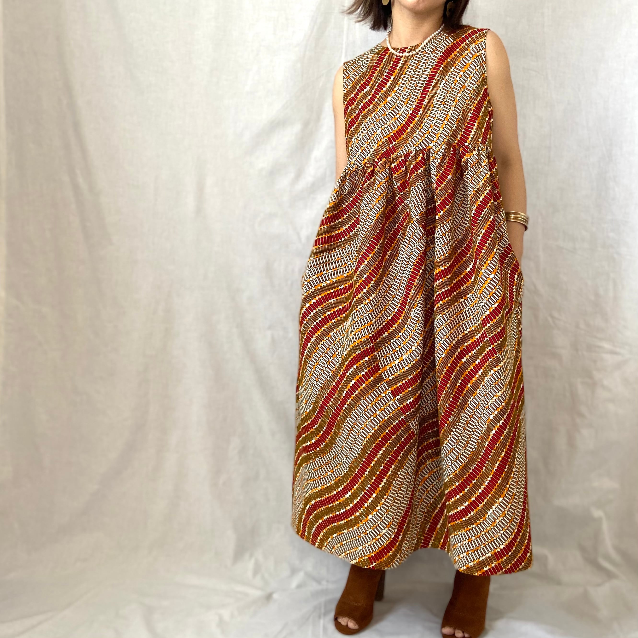 アフリカンプリント生地を使ったハイウエストに切り替えの入ったギャザーワンピース。